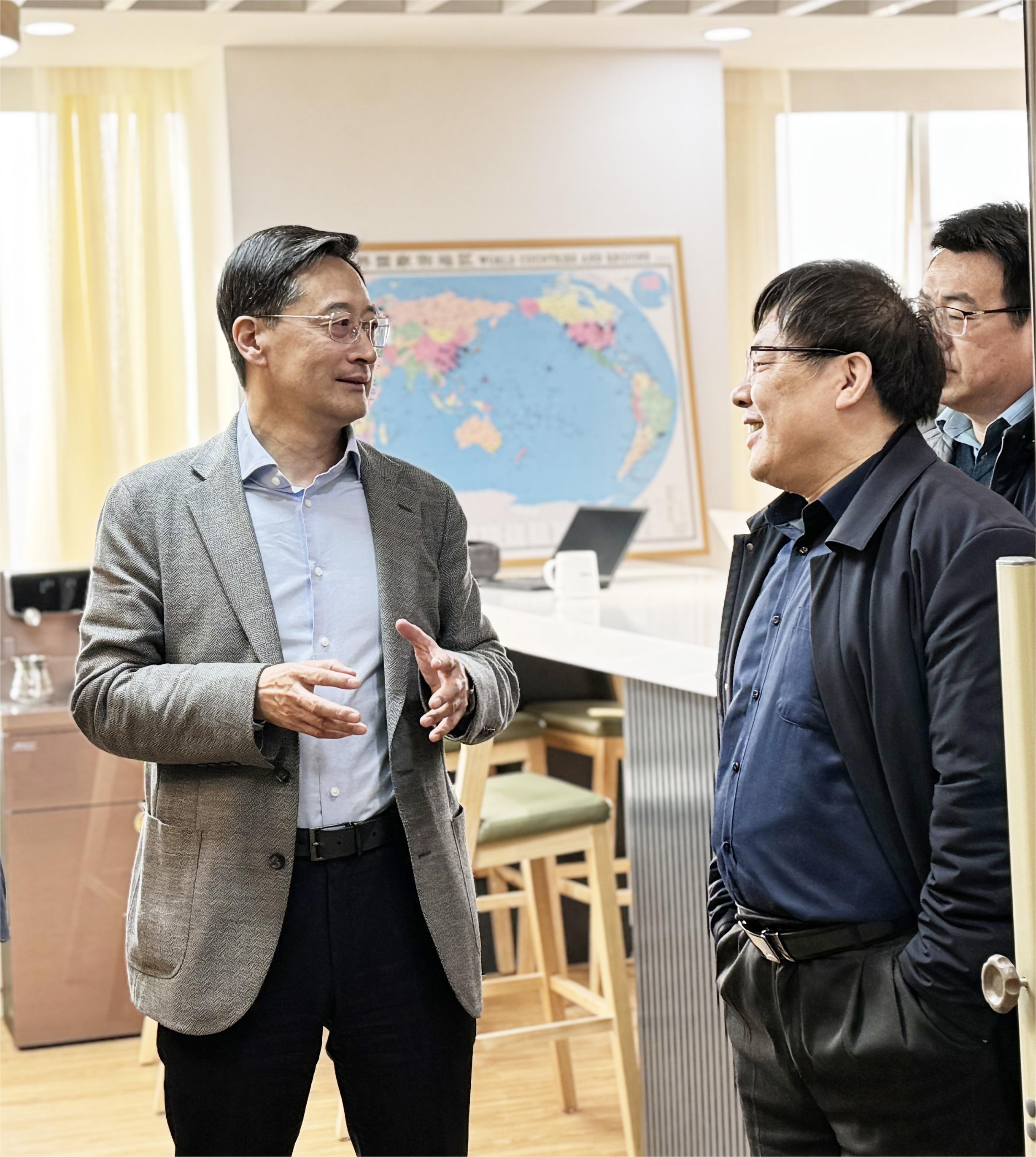 王云鹏一行来到柏彦大厦,实地察看了彭桓武科教合作中心、空间科学科教合作中心和原子制造中心的空间规划和建设情况,并与各中心负责人就未来研究方向和工作重点进行了深入交流。