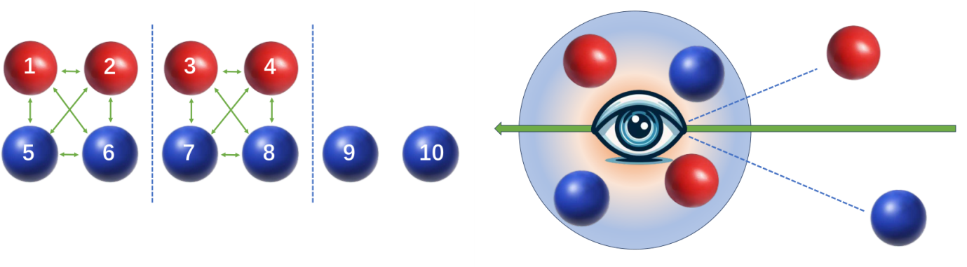 图1:核子分组算法及α团簇观测视角示意