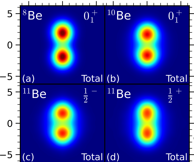图2:(左图)铍-8、铍-10、铍-11(基态与第一激发态)总密度分布;(右图)铍-11不同态价中子分布