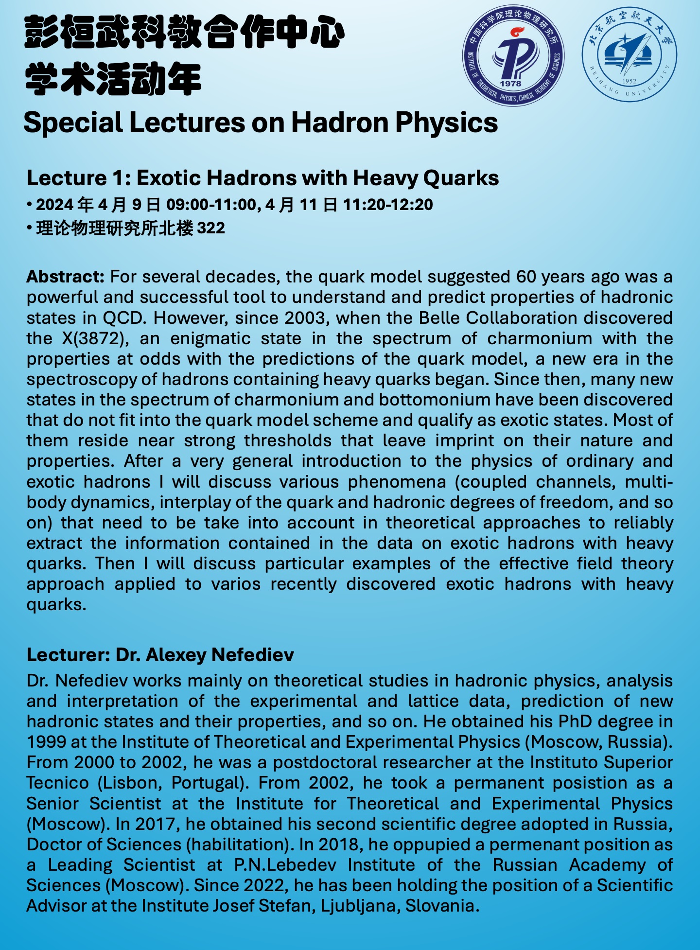 Dr.Nefediev works mainly on theoretical studies in hadronic physics, analysis and interpretation of the experimental and lattice data, prediction of new hadronic states and their properties, and so on. He obtained his PhD degree in 1999 at the Institute of Theoretical and Experimental Physics (Moscow, Russia). From 2000 to 2002, he was a postdoctoral researcher at the Instituto Superior Tecnico (Lisbon, Portugal). From 2002, he took a permanent position as a Senior Scientist at the Institute for Theoretical and Experimental Physics (Moscow). In 2017, he obtained his second scientific degree adopted in Russia, Doctor of Sciences (habilitation). In 2018, he occupied a permanent position as a Leading Scientist at P.N.Lebedev Institute of the Russian Academy of Sciences (Moscow). Since 2022, he has been holding the position of a Scientific Advisor at the Institute Josef Stefan, Ljubljana, Slovania.