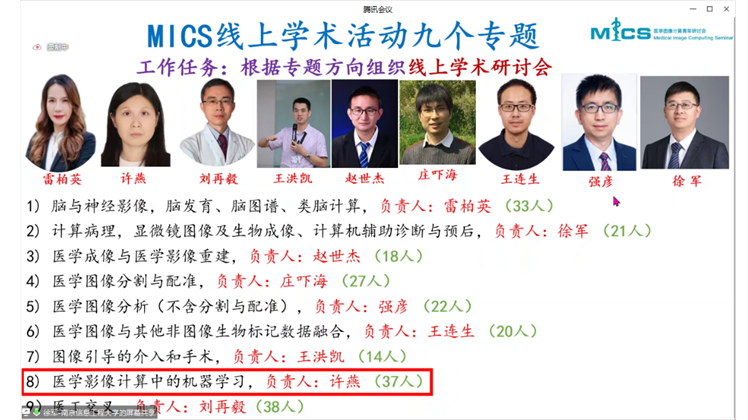 医学图像计算青年研讨会 (Medical Imaging Computing Seminar, MICS) 旨在为医学影像分析领域的全球华人学者提供学术交流平台,增进本领域科研人员和医学专家的交流和合作。自2022年底开始,MICS聚焦“脑与神经影像,脑发育、脑图谱、类脑计算;计算病理,显微镜图像及生物成像、计算机辅助诊断与预后;医学成像与医学影像重建;医学图像分割与配准;医学图像分析(不含分割与配准);医学图像与其他非图像生物标记数据融合;图像引导的介入和手术;医学影像计算中的机器学习;医工交叉”九大专题方向展开线上研讨。