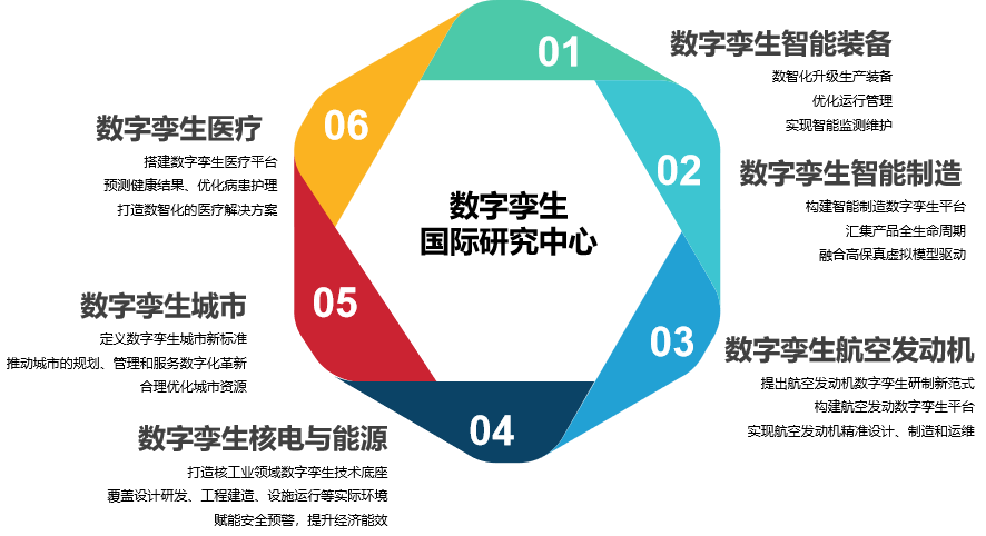 中心结合北航特色学科方向和国际专家团队研究优势,重点开展“六个方向”的研究:数字孪生航空发动机、数字孪生智能制造、数字孪生智能装备、数字孪生医疗、数字孪生核电与能源、数字孪生城市等。通过探索创新数字孪生基础理论、重点攻克数字孪生融合应用关键核心技术,推动面向不同领域的“数字孪生+”的创新应用。
